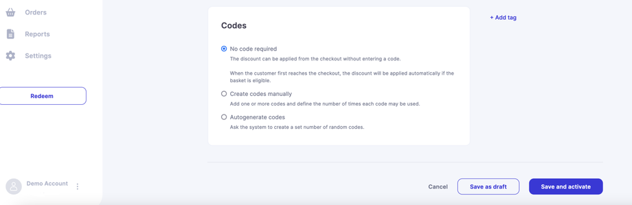 - Autogenerate codes - Ask the system to create a set number of random single use codes, these can be used for personalised email campaigns where marketing email providers will be able to track which users used which codes.