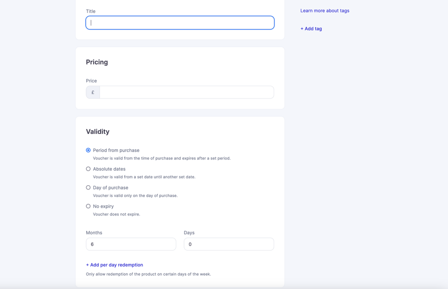 - Add per day redemption - If you only want your product variant to be redeemed on certain days, for instance, midweek vs weekend, make sure you add your per day redemption limits.
