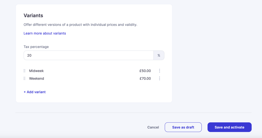 - Name - This is the name you want customers to see for the variant, this could be midweek / weekend, or date ranges, or the name of a room type etc.