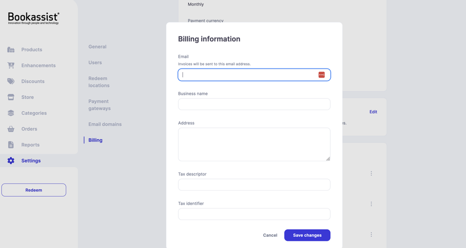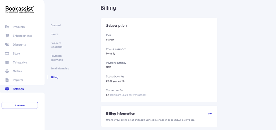 The next section gives the opportunity to change the billing email and business information which will be shown on your invoices.