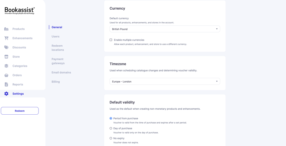 - Timezone - Set your local timezone, this is mainly used when scheduling catalogue changes and determining voucher validity and expiry.