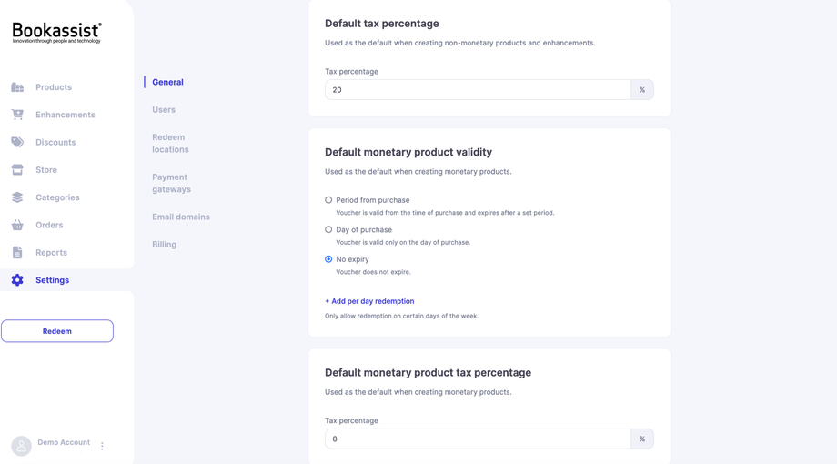 - Default monetary product tax percentage - We would highly recommend this is set to zero, monetary gift cards should have a zero tax rate, as they will be double taxed when they use the gift card / voucher to pay for goods and services from your business.