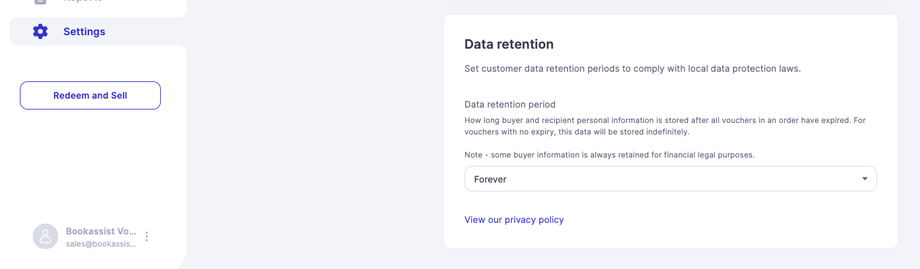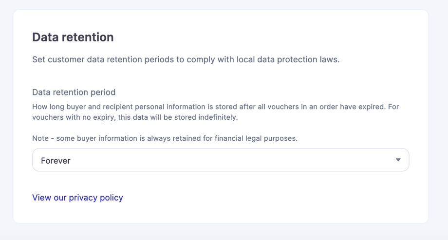 Select the period appropriate for your business using the drop down menu, this will dictate how long buyer and recipient personal information is stored after all vouchers in an order have expired (we need to keep all customer information before this point to successfully redeem!)