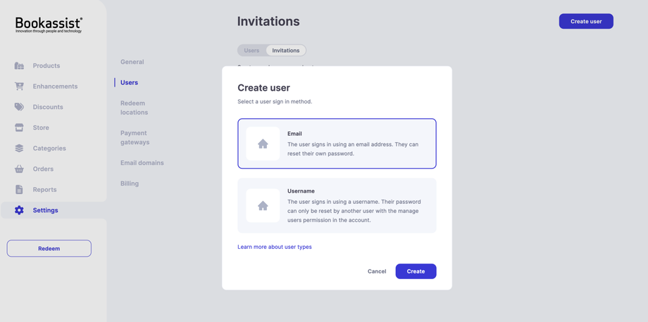 - Username Users - The user signs in using a username, their password can only be reset by another user with the manage users permission in the account. Our recommendation would be to use this option for employees and keep email users for administrators.