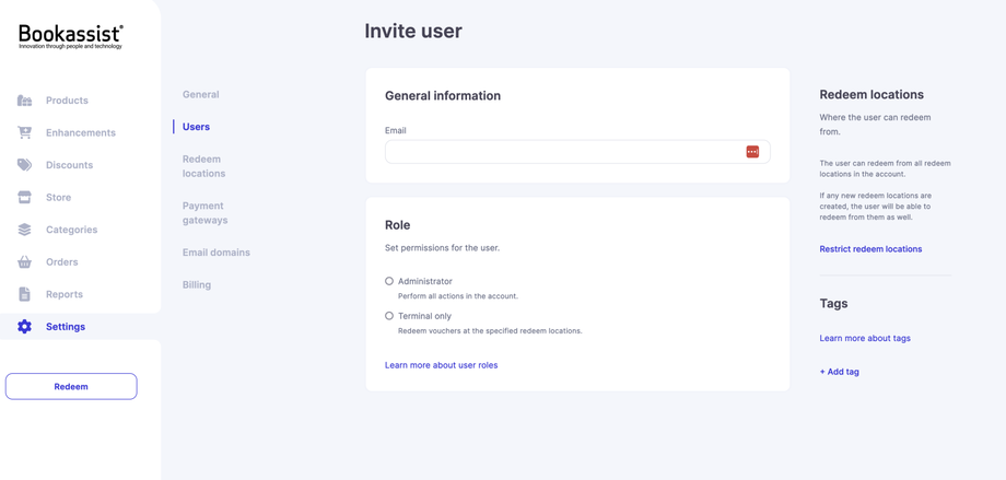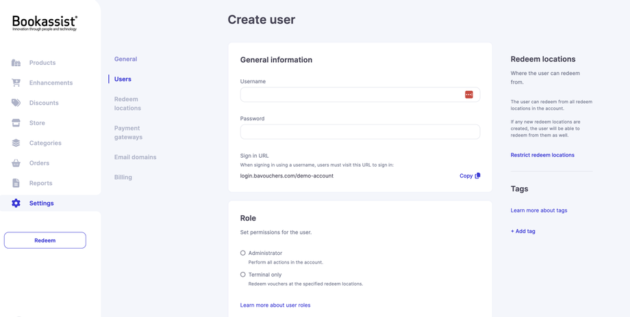 In the BA voucher system you can add, manage and remove user access to your BA voucher admin area. There are a number of options to consider when setting up a user.