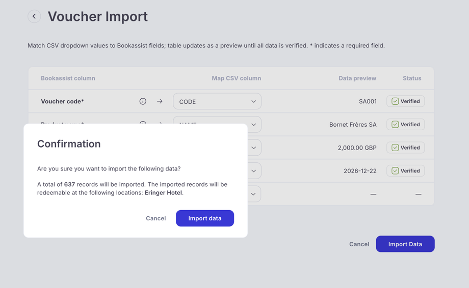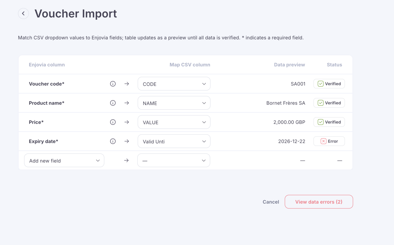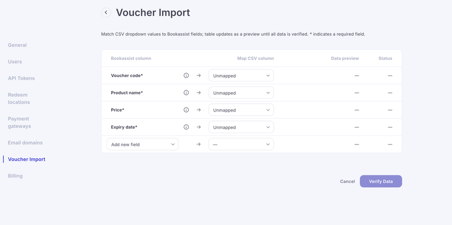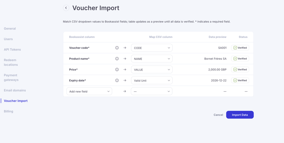 When you upload your CSV, the system will show this field mapping page. This is where you tell the importer which columns in your file match our voucher fields.
