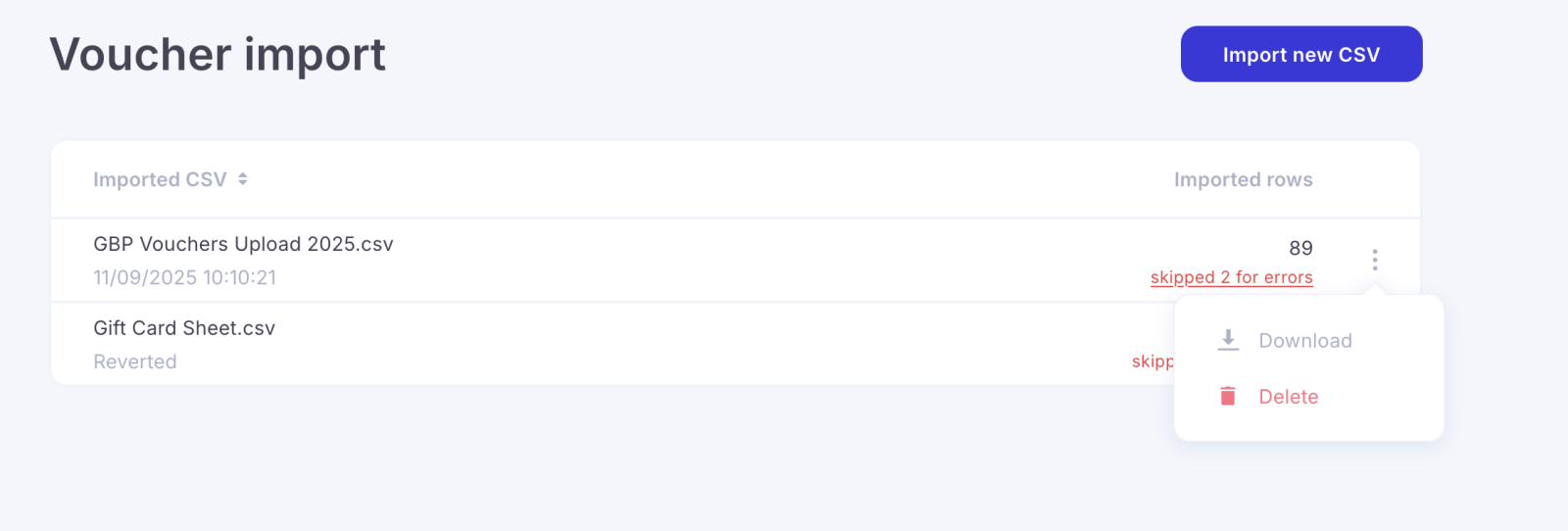 If you delete or revert an import, the system will treat it as if it never existed. This means that any actions previously taken on those imported vouchers (e.g., a voucher that had already been redeemed) will no longer be reflected in the system.